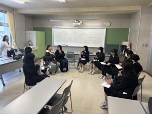 本日の進路学習では、MOCKグループを経営され、店舗運営を行っている森田氏と市内某クリニックで勤務する看護師である羽田野氏に来校していただき、標記の授業を実施しました。