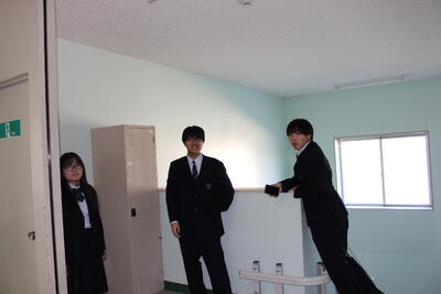 「動画クリエイト」チームは講師の松浦さんに動画撮影のレクチャーを受けた後、校内を練り歩き、動画撮影を行っていました。2枚目の写真は動画の構図を練っている写真で、決して教室を抜け出しているわけではありません・・・。