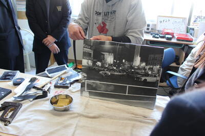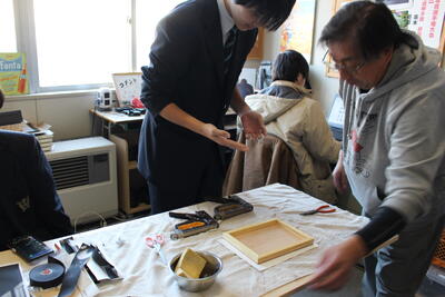 「写真プロジェクト」チームは、本校の米長先生に加え、講師の小椋さんをお招きして、パネル貼り作業のレクチャーを受けています・・・教員では伝えられない「技」です。