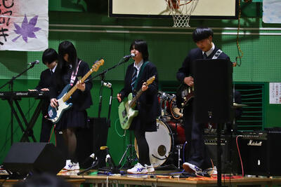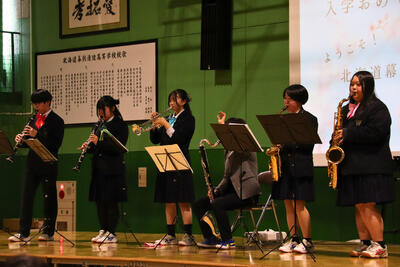 新入生は吹奏楽部の力強い生演奏に合わせて堂々と入場。開会宣言直後には軽音楽部によるライブパフォーマンスが披露されました。