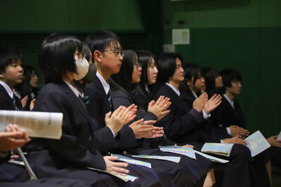 後半の部活動紹介では、各部が動画やスライドを交えながら、日頃の活動内容をアピールしました。新入生たちは、どの部活動に入ろうか真剣な眼差しで見つめていました。