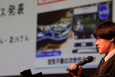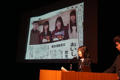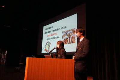 開会式に続き、1・2年生による「地域連携マイプロジェクト」の発表が行われました。1学年と2学年の代表グループが登壇し、地域と連携した探究活動の成果をプレゼンテーションしました。
