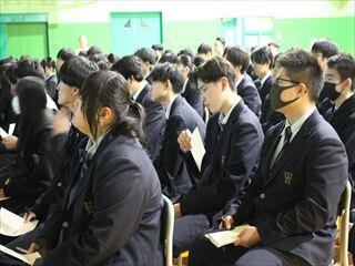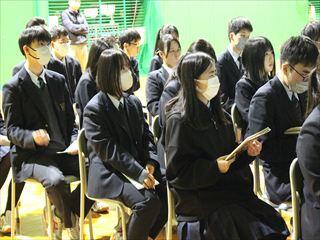 はじめに「薬」という漢字の成り立ちから、薬には使い方のルールがあるという導入から始まりました。そして、今後薬物使用を誘われた時の対処方法と、楽に死ねるイメージが先行しているが致死量に至るほど多量の薬は非常に苦しいというお話に、我が事として真剣に聴いている生徒の姿が見られました。