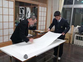 校外展の季節がやってきました。部活動指導員鈴木譲二先生の指導日を2回使って、裏打ちを行いました。1年生にとっては初めての作業です。譲二先生の指導のもと、全部で30点弱の裏打ちをようやく終えることができました。この後は、作品の体裁を整える作業、年間の活動紹介や作品紹介の展示品、作品札を作成します。冬休み中から頑張っているのですが、広島交流事業やオーストラリア研修を控えてなかなか思うように作業は進まず、日々焦りと戦いながら活動しています。
