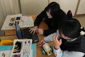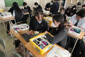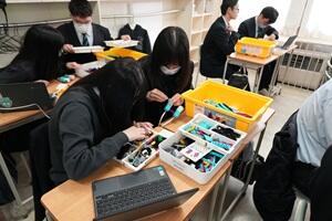 昨年度から2年生「情報Ⅰ」の授業で行っているロボット制御プログラミング。
