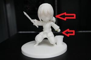 ここから、サポート材(※宙に浮いている部分を印刷するために必要な支柱。上の写真の人形周りについている壁のようなものがサポート材)を取り除いているときに悲劇が・・・!!!